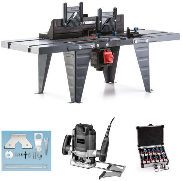 Komplett felsőmaró asztal szett: FERREX maróasztal + 1200W felsőmarógép, 16 db maróbittel. Erős, öntött alumínium asztallappal, acéllemez lábakkal. Az asztallap a mellékelt toldatokkal meghosszabbítható 455-ről 855 mm szélességre. A csomag kétoldali nyomófésűt és szögütközőt tartalmaz. A felsőmarógép fában, műanyagban és könnyűszerkezetű anyagokban stabil felületen lévő hornyok, élek, profilok és hosszanti lyukak marására, valamint másolómarásra készült. - 6 / 6.35 / 8 mm szerszámbefogó, 11000 - 30000 / perc fordulatszám - XL csomag: tartozék 14 db maróbittel, fém tároló dobozban - Marókosár löket: 55 mm - Teljesítmény: 1200W Garancia (fogyasztóknak): 3 év FERREX WWS-OFT-20 maróasztal: - Névleges feszültség: 230 V - Névleges frekvencia: 50Hz - Asztal méret: 455 x 332 mm x 280 mm - Asztal méret hosszabbító toldatokkal (tartozék): 855 x 335 x 280 mm - Magassága: 28 cm - Védettségi fokozat: IP20 - Érintésvédelmi osztály: II - Tömeg: 7 kg - Erős, öntött alumínium asztallap, acéllemez lábakkal - Gérvágó vezetősínekkel - Állítható főkeret visszaállítható védősapkákkal - Legnagyobb feltehető marógép talp alapátmérő: 155 mm - Maximális maróátmérő: 22 mm - A telepíthető marógép maximális súlya: 3.5 kg - A használni kívánt marógép maximális teljesítménye: 1800W - Az asztali maró csak a 155 mm-es vagy annál kisebb alapátmérővel rendelkező gépekhez használható - Tartozék 5 db asztali / gyűrűs betét: 1/2 - 3/4 - 1 - 1 1/4 - 11/2 - Elektromágneses biztonsági kapcsoló - 0,5 m-es VDE kábel, VDE csatlakozóval - Nyomógombos ki-be kapcsoló - A marógép az asztalon lévő konnektorba csatlakoztatható, a nyomógombokkal kapcsolhatjuk be-ki. - Bal- és jobboldali nyomófésű a munkadarab biztonságos lenyomásához - Szögütköző - A munkadarab maximális méretei: 100 mm szélesség x 2000 mm hossz x 55 mm magasság - Gyártó: Walter Werkzeuge Salzburg GmBH, Ausztria - Származási hely: Kína - Cikkszám: 815624 - Márkanév: FERREX - Típus: WWS-OFT20 FERREX WWS-OFR-1200 Felsőmarógép XL csomagban, 14 db maróbittel - Fa, könnyű építőanyagok és színesfémek sokoldalú és precíz megmunkálásához - Fokozatmentesen beállítható mélységütköző finombeállítással - A marásmélység gyors beállítása forgatható lépcsős ütközővel - Fokozatmentesen állítható fordulatszám 11000 - 30000 fordulat / perc között - Egyszerű szerszámcsere - beépített orsórögzítés - Csatlakozási lehetőség porelszívóhoz - Kereskedelemben kapható szokványos 6 vagy 6.35 vagy 8 mm-es szárú maróbitekhez - Teljesítmény: 1200W - Névleges feszültség: 230 V ~, 50 Hz - Névleges üresjárati fordulatszám: 11000 - 30000 / perc - Marókosár löket: 55 mm - Szerszámbefogó: 6 mm / 6.35 mm / 8 mm (szerelve) - Védelmi osztály: II - Tápkábel hossza: 2 méter - Mérete: kb. 210 x 160 x 110 mm - Súlya: 5 kg A csomag tartalma - 1 db FERREX WWS-OFR1200 felsőmarógép - 1 db FERREX WWS-OFT20 maróasztal - Kétoldali nyomófésű és szögütköző - 1 db befogókulcs (villáskulcs) - 1 db befogógyűrű 6 mm - 1 db befogógyűrű 6.35 mm (1/4) - 1 db befogógyűrű 8 mm (felszerelve) - 1 db elszívóadapter - 1 db párhuzamos ütköző 2 vezetőrúddal - 1 db Sablonvezető - 1 db Marokrögzítő - 2 db Maróbit (6 mm) - 14 db Maróbit (8mm) fém tároló dobozban - 1 db párhuzamos vezetőléc - 1 pár pótszénkefe - 1 db használati útmutató 14 darabos kiegészítő maróbit készlet fém dobozban: - különböző marófejekből és tartozékokból álló, 15 részes készlet - puhafához, keményfához és közepes sűrűségű farostlemezhez (MDF-lap) - max. 125 mm átmérőjű felsőmaróhoz alkalmas (pl FERREX, ParkSide)